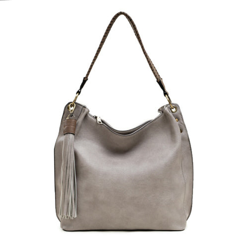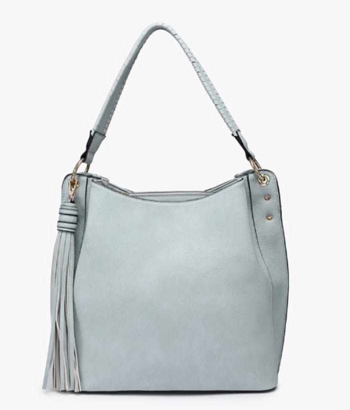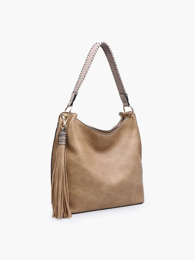 The perfect slouchy hobo, Amber features a large, decorative tassel and a comfortable handle! Includes both inner zip and slip pockets and herringbone lining. Made from vegan leather and perfect for monogramming. Made of vegan leather. Dimensions: 13"L x 5"D x 11.5"H