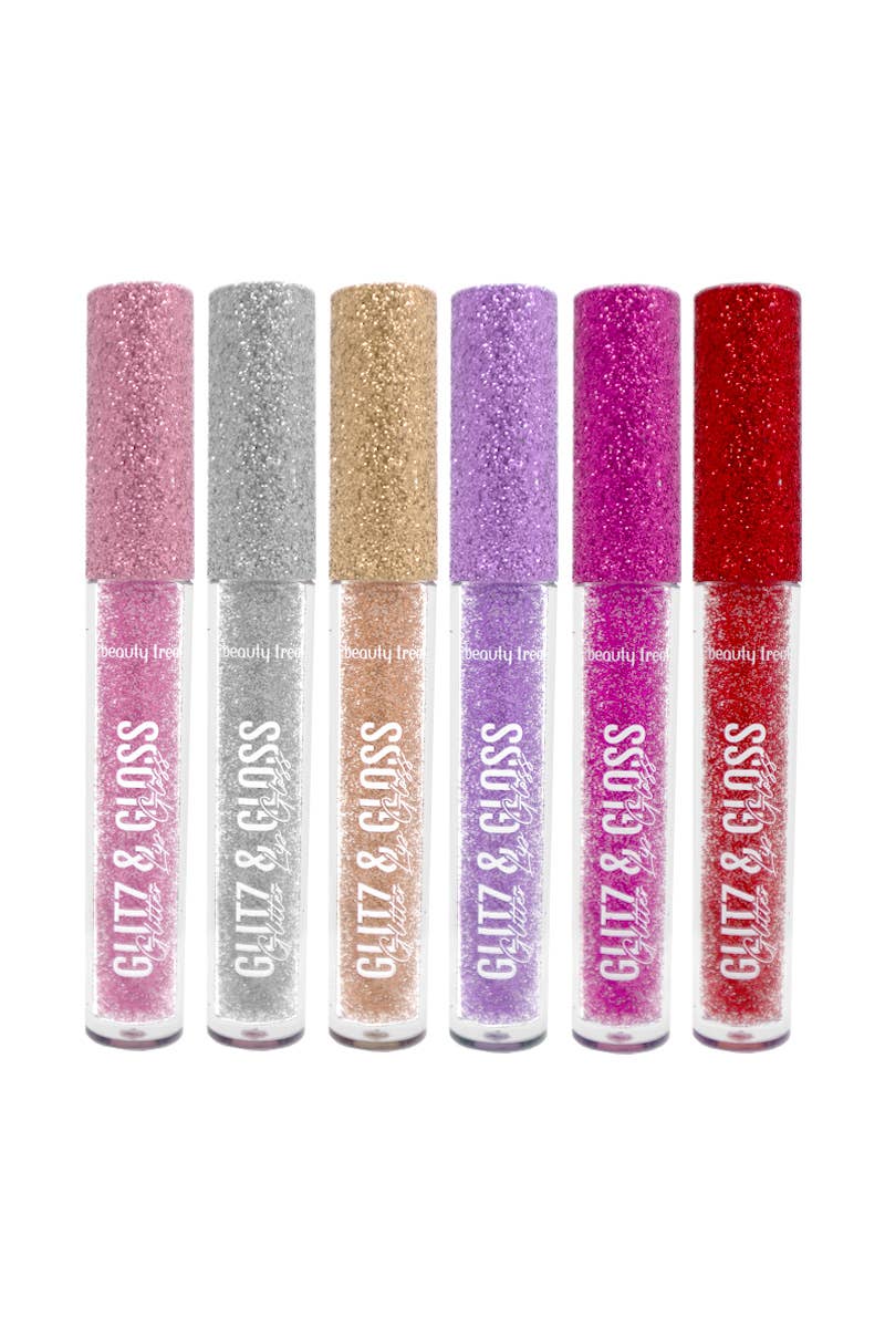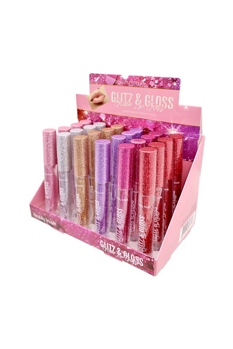 Beauty Treats 516 Glitz & Gloss Glitter Lip Gloss. Glitz & Gloss Glitter Lip Gloss for dazzling lips. Available in six stunning shades soft Pink, dazzling Silver, luxe Gold, vibrant Purple, bold Hot Pink, and classic Red this lip gloss features small glitter particles that catch the light beautifully. The smooth formula delivers a high-shine finish with a touch of sparkle that feels as good as it looks. Whether aiming for a subtle shimmer or a full-on glam vibe, Glitz & Gloss has the perfect shade to elevate any style. 24 pcs in box.