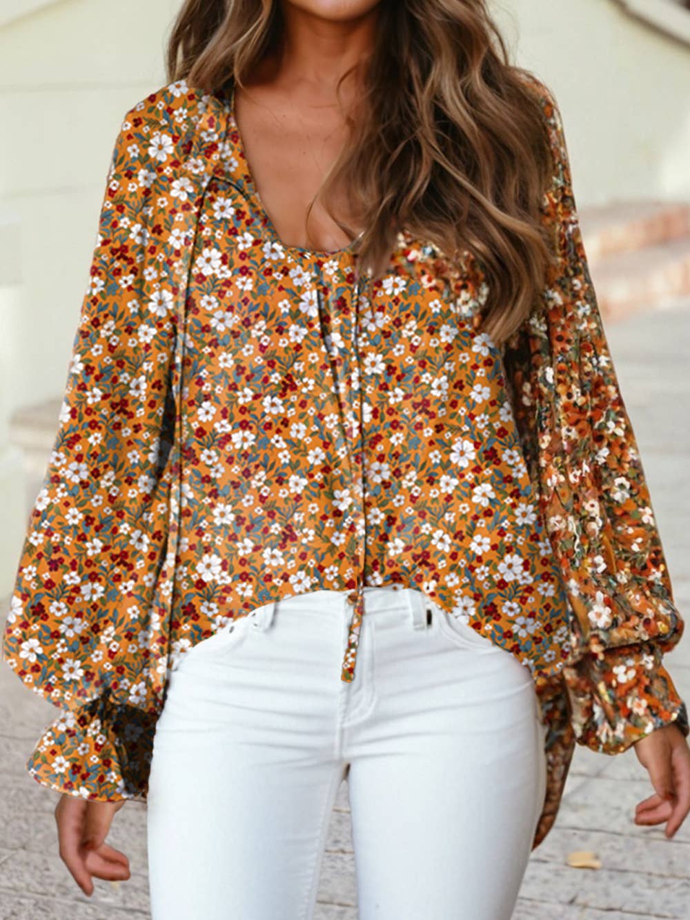 Boho Floral Ruffled Bubble Sleeve V Neck Fall Blouse