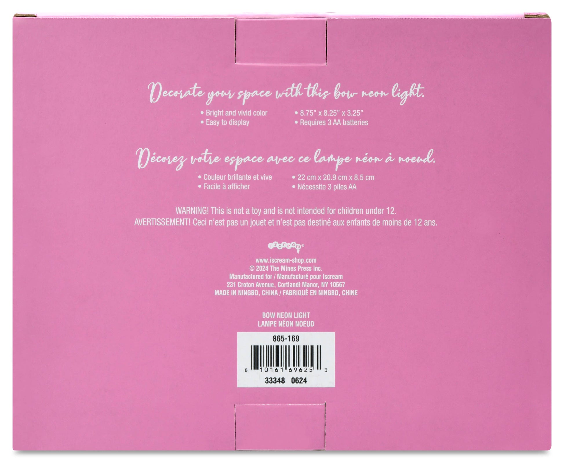 Iscream's beautiful bow-shaped neon light from  is a must-have for any girl's bedroom. Crafted from durable plastic, it's designed to withstand the playful nature of kids and add a touch of fun and excitement to any space. LED light, Uses 3 AA batteries (not included), Packaged in a box, 8 3/4" w x 7 1/2" h x 2 1/4" d