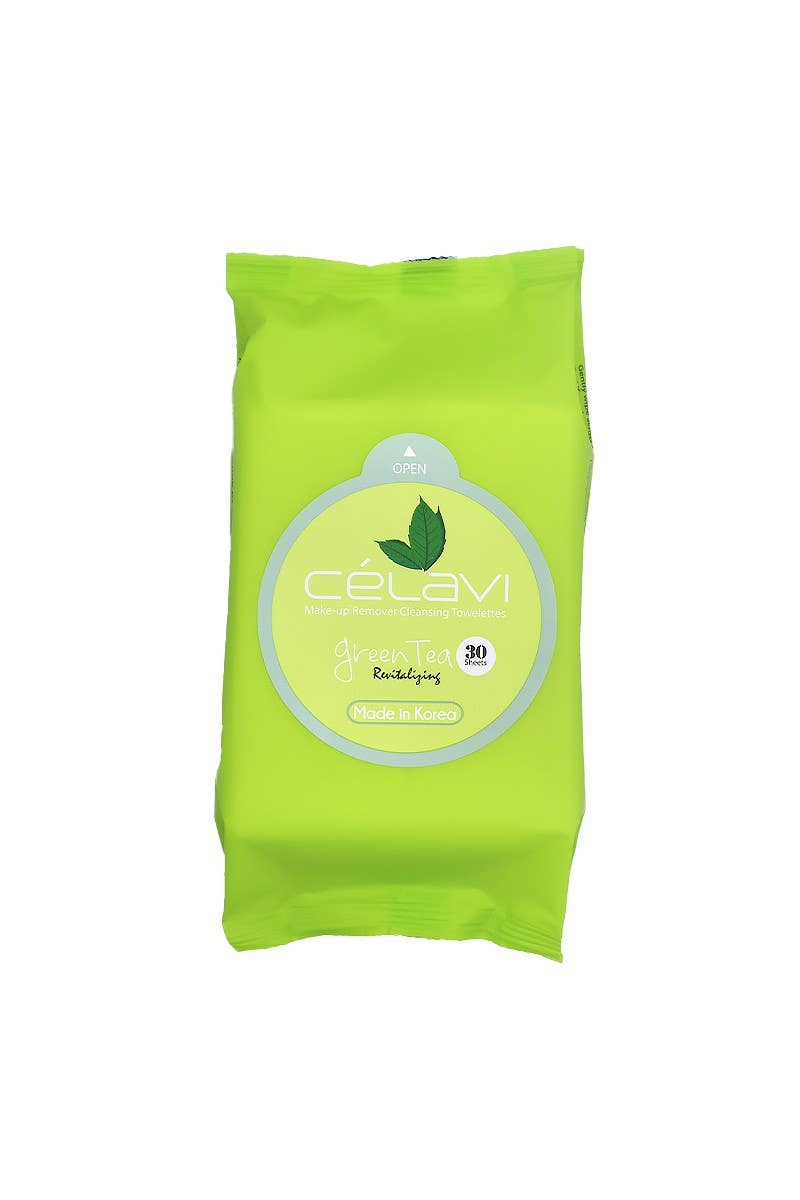 Celavi Green Tea Make-up Removing Cleansing Towelettes. Nourishes and Illuminates skin. Removes makeup, dirt and oil. Green Tea helps revitalize skin. 30 wipes in pack. Made in Korea.