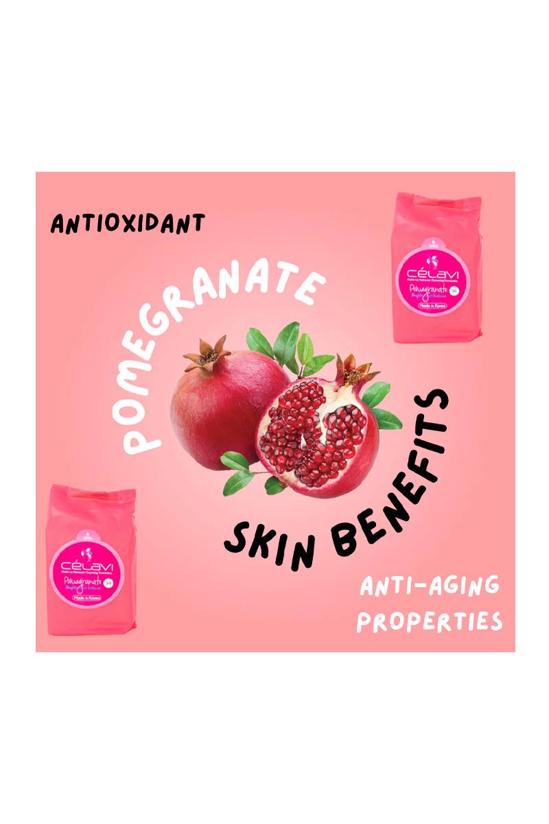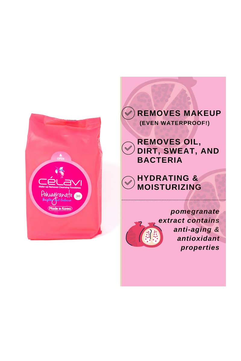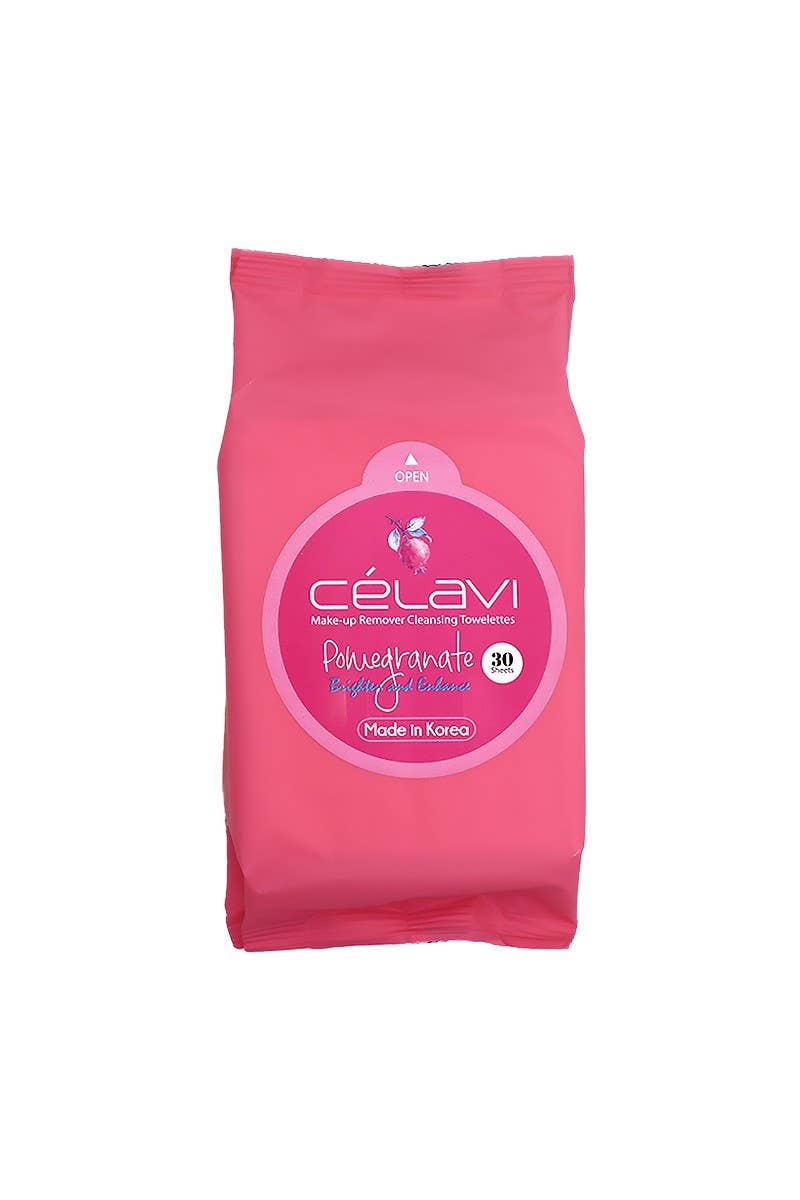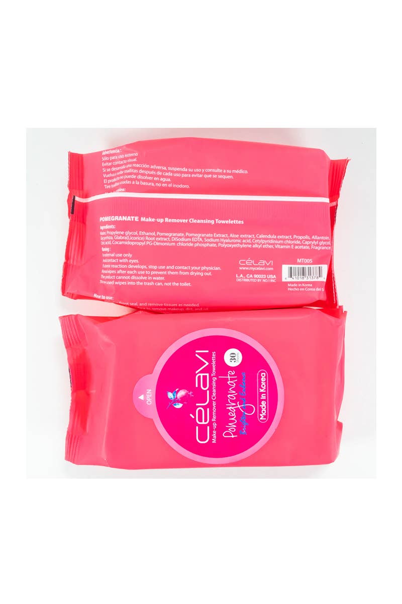Celavi MT005z Pomegranate Make-up Removing Cleansing Towelettes. Nourishes and Illuminates skin. Removes makeup, dirt and oil. Pomegranate helps brighten and enhance skin. 30 wipes in pack. Made in Korea. 6 packs in display.