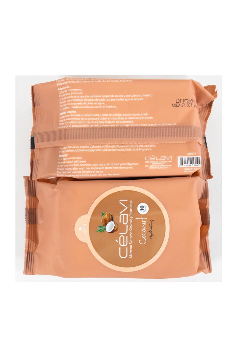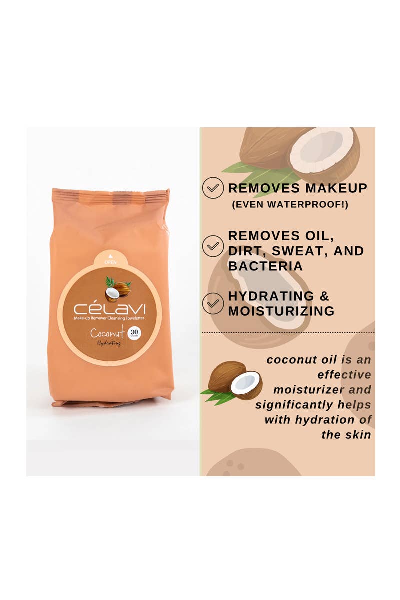 Celavi MT015 Coconut Make-up Removing Cleansing Towelettes. Nourishes and Illuminates skin. Removes makeup, dirt and oil. Coconut helps hydrate and smooth skin. 30 wipes in pack. Made in Korea.