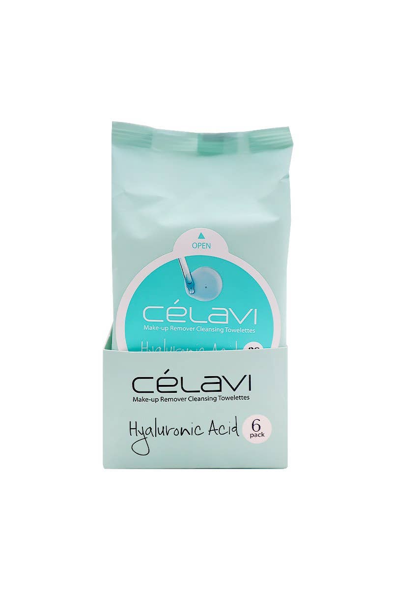 Celavi MT018 Hyaluronic Acid Make-up Cleansing Towelettes. Nourishes and Illuminates skin. Removes makeup, dirt and oil. Hyaluronic Acid helps hydrate and define skin. 30 wipes in pack. Made in Korea. 6 packs in display.