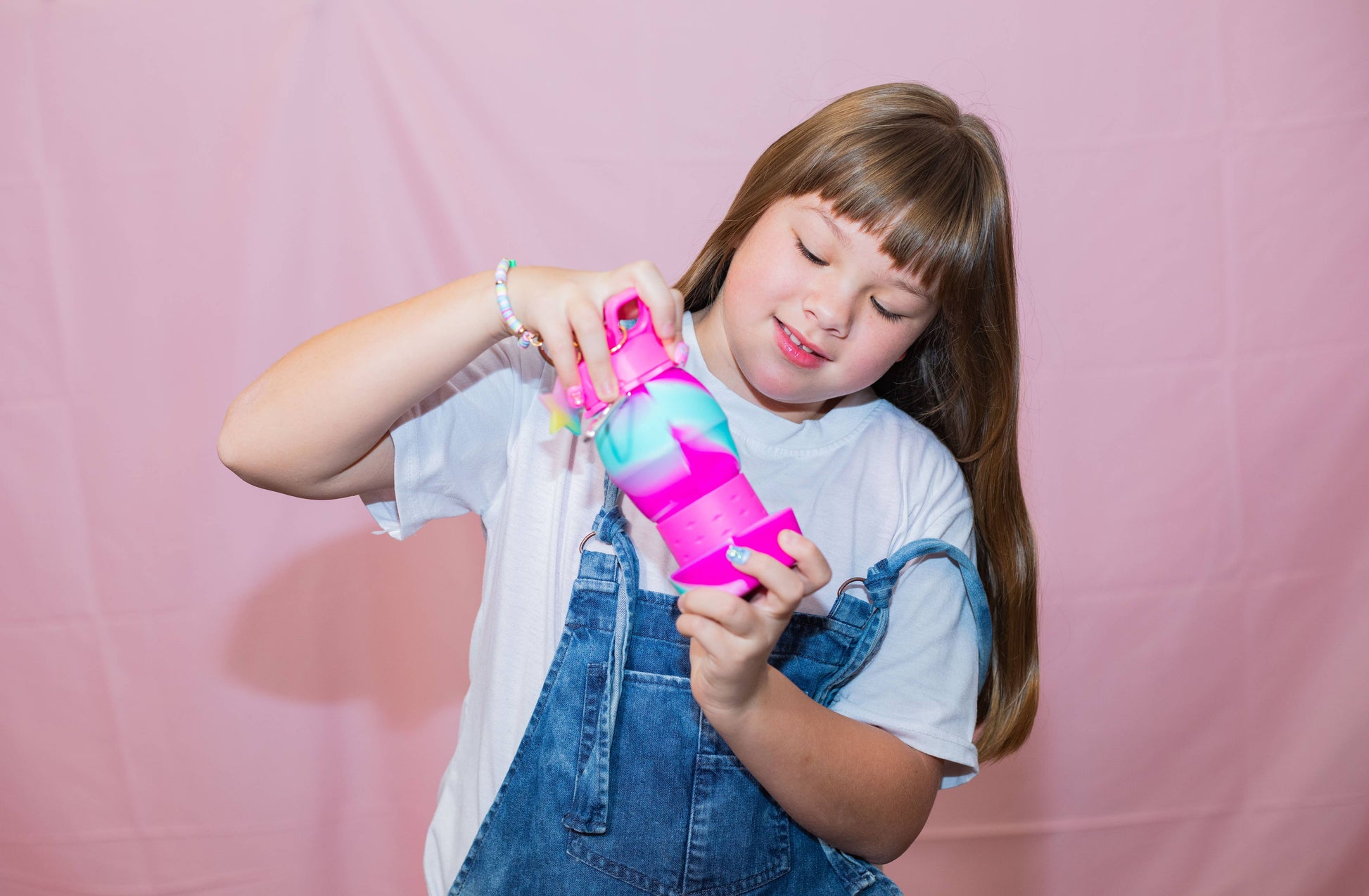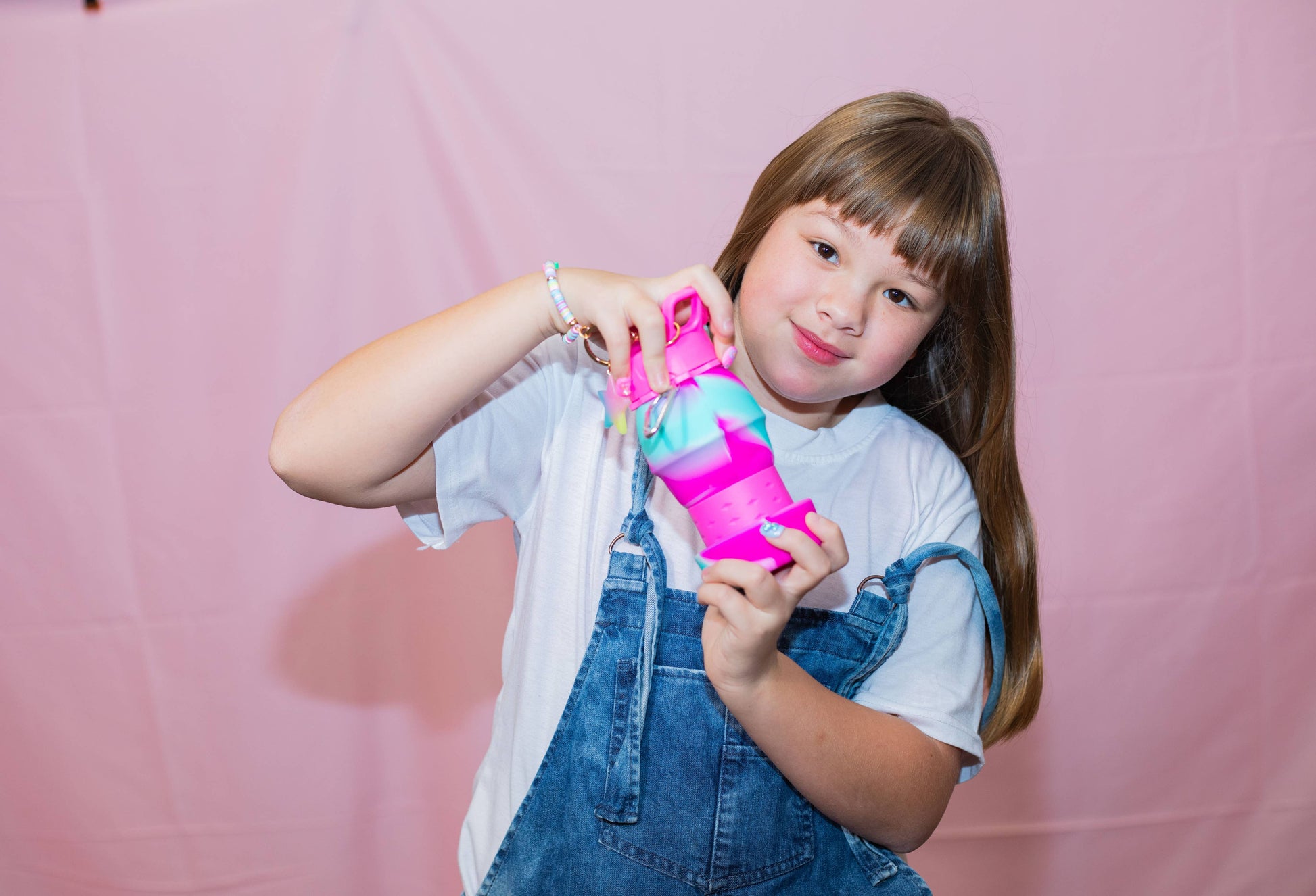 This collapsible water bottle is easy to carry everywhere! Kids will love the fashion colors and the bonus light up with sound keychain.
