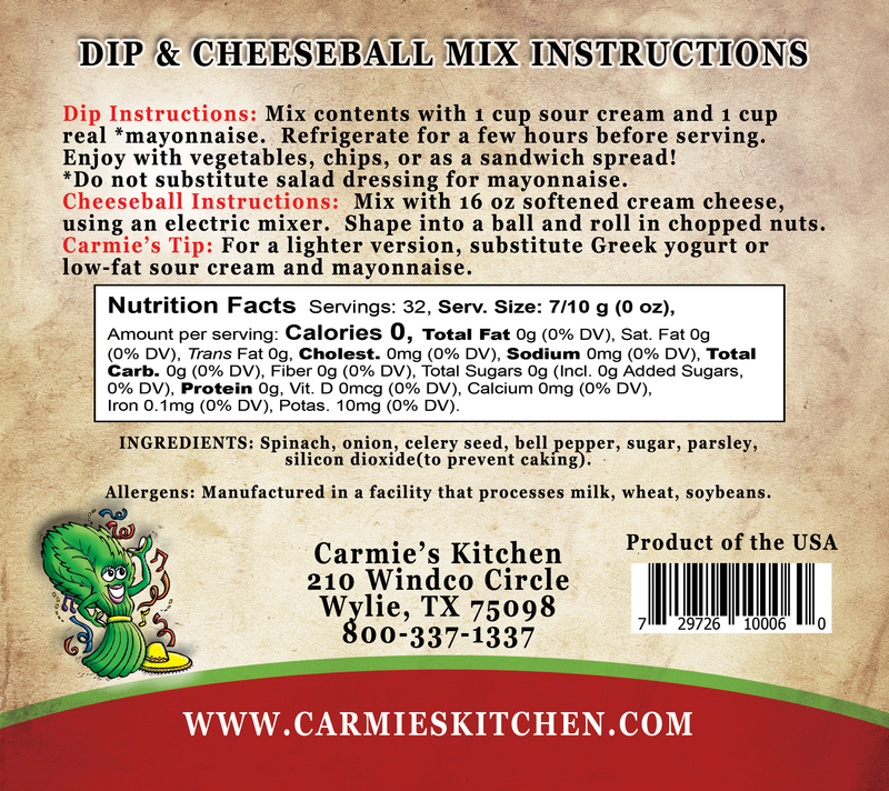 Tried and true combo of spinach, bell pepper, and other natural herbs and spices to be one of our most popular dip mixes.