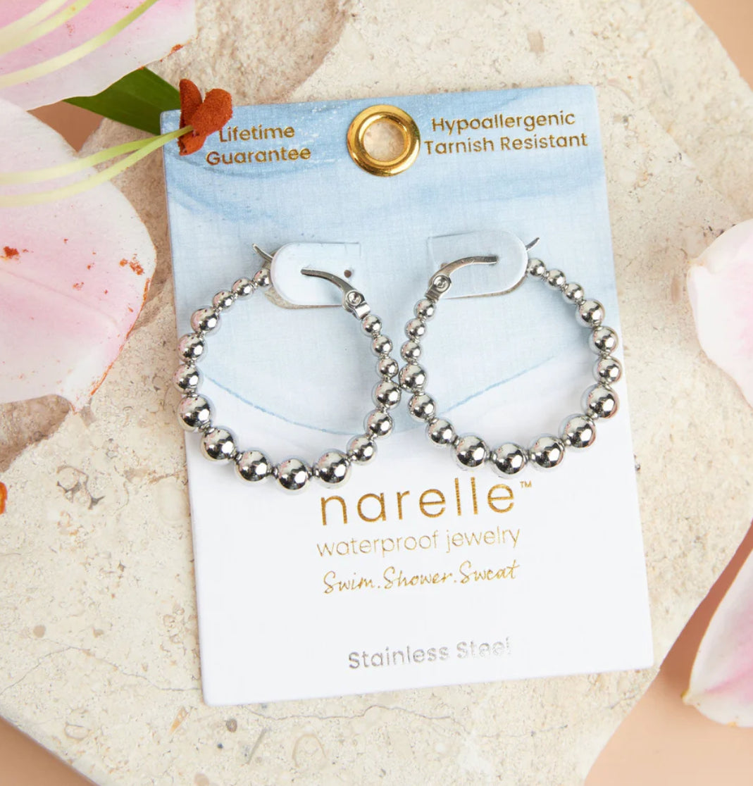 Chic and understated, the Narelle Waterproof Bubble Hoop Earrings offer a trendy bubble hoop design in the classic, goes-with-everything silver. With a familiar pin catch closure and effortless style, these earrings will easily become a wardrobe staple. Waterproof , stainless steel plated and made with a specialized PVD technique to withstand the rigors