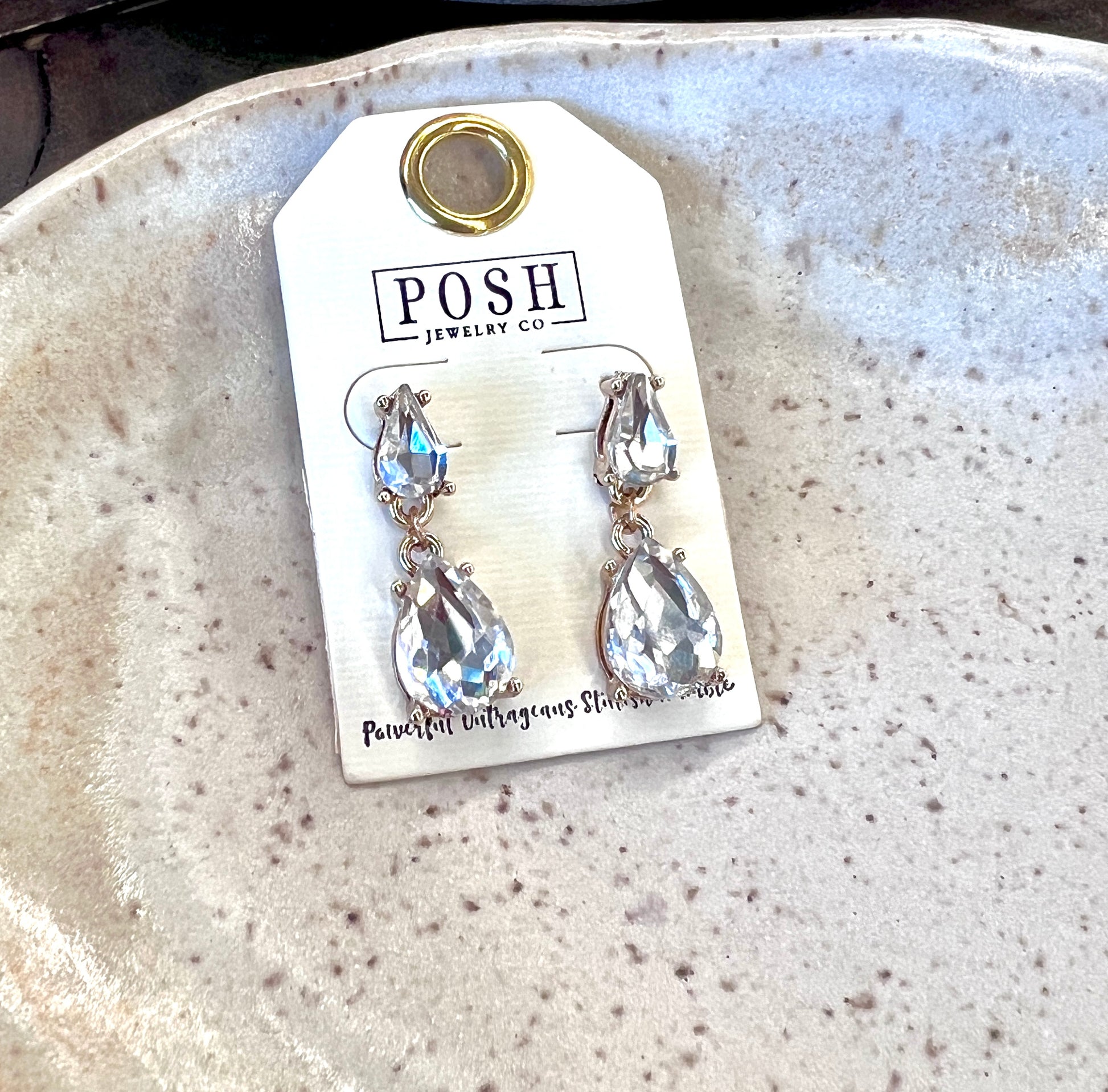 Double-teardrop rhinestones make up these post earrings. Approximately 2 inches in length.