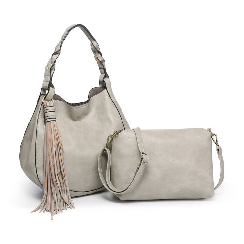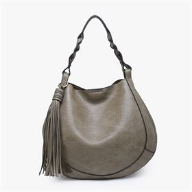 This two in one is perfect for you! Round hobo with large side tassel and braided handle. Inner bag has crossbody strap.