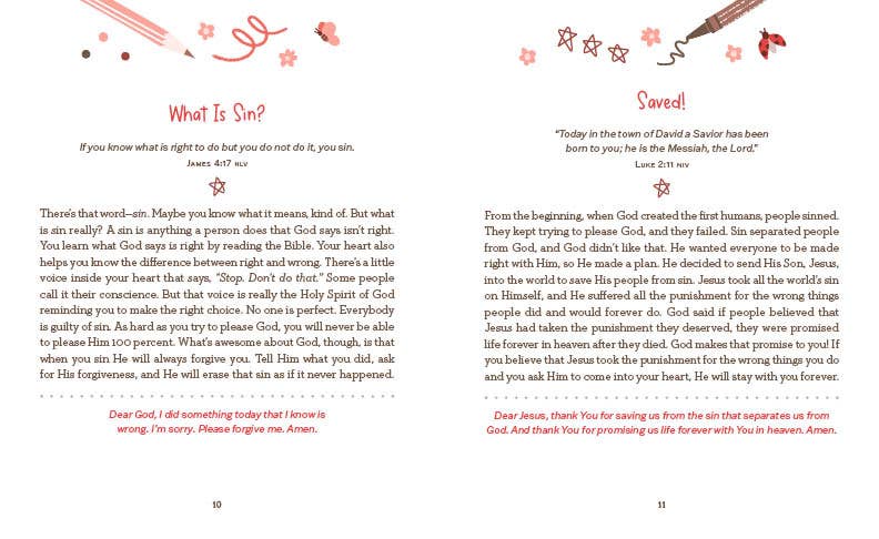 With every turn of the page, your girls, ages 8 to 12, will discover hopeful and encouraging messages just for their hearts. Each devotional reading is rooted in the timeless wisdom of the Bible, helping girls to discover firsthand the awesome impact of God's Word on everyday life. Touching on topics like Choices, Kindness, Love, Loyalty, Honesty, and so much more, these just-right-sized readings will meet the girls in your life right where they are in life. For Girls Only is a great way to help girls grow in their faith!