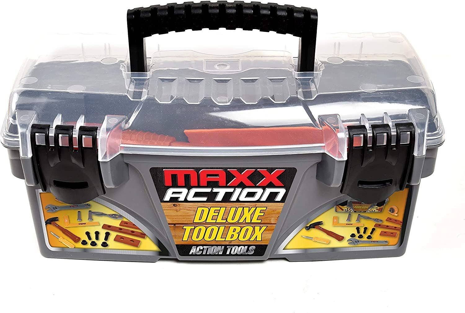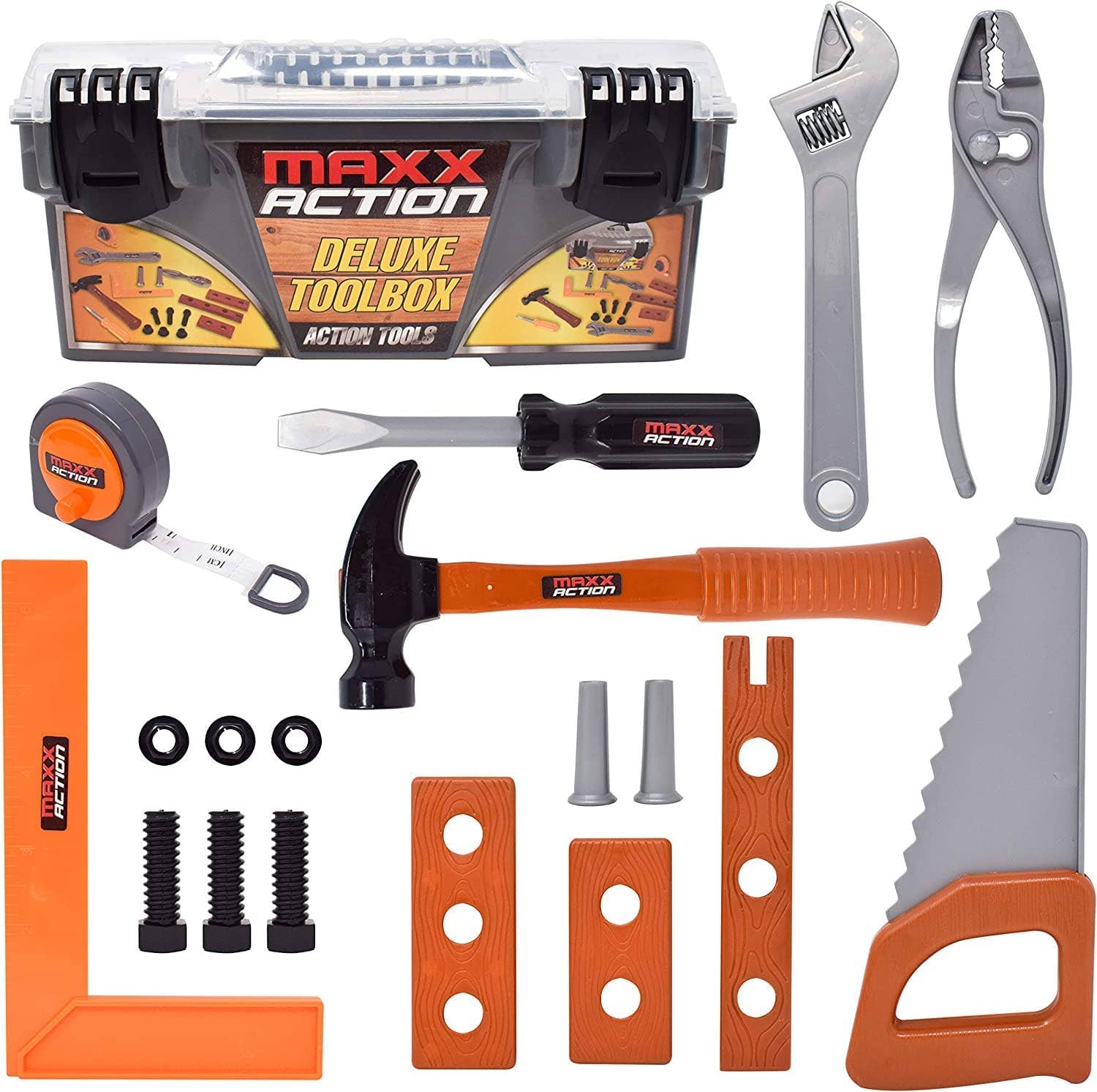 Give your little one everything they need to build and make pretend home improvements with the Maxx action tool box. This set includes 18 pieces including a working measuring tape, hammer, screw driver, kid safe saw, wrench, pliers, and more! When the job is done, the tools fit easily in the durable tool box.