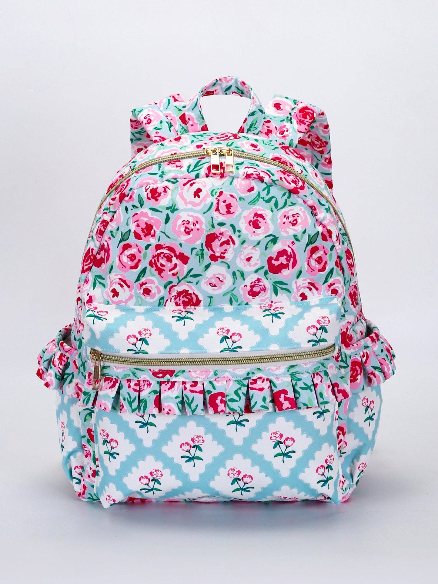 * Size:13*5*17 inches Pink Flower Kids Ruffle Backpack This backpack is the perfect size for kids, measuring 13*15*17 inches. It's designed to be long-lasting and spacious. Your child will love carrying it around!