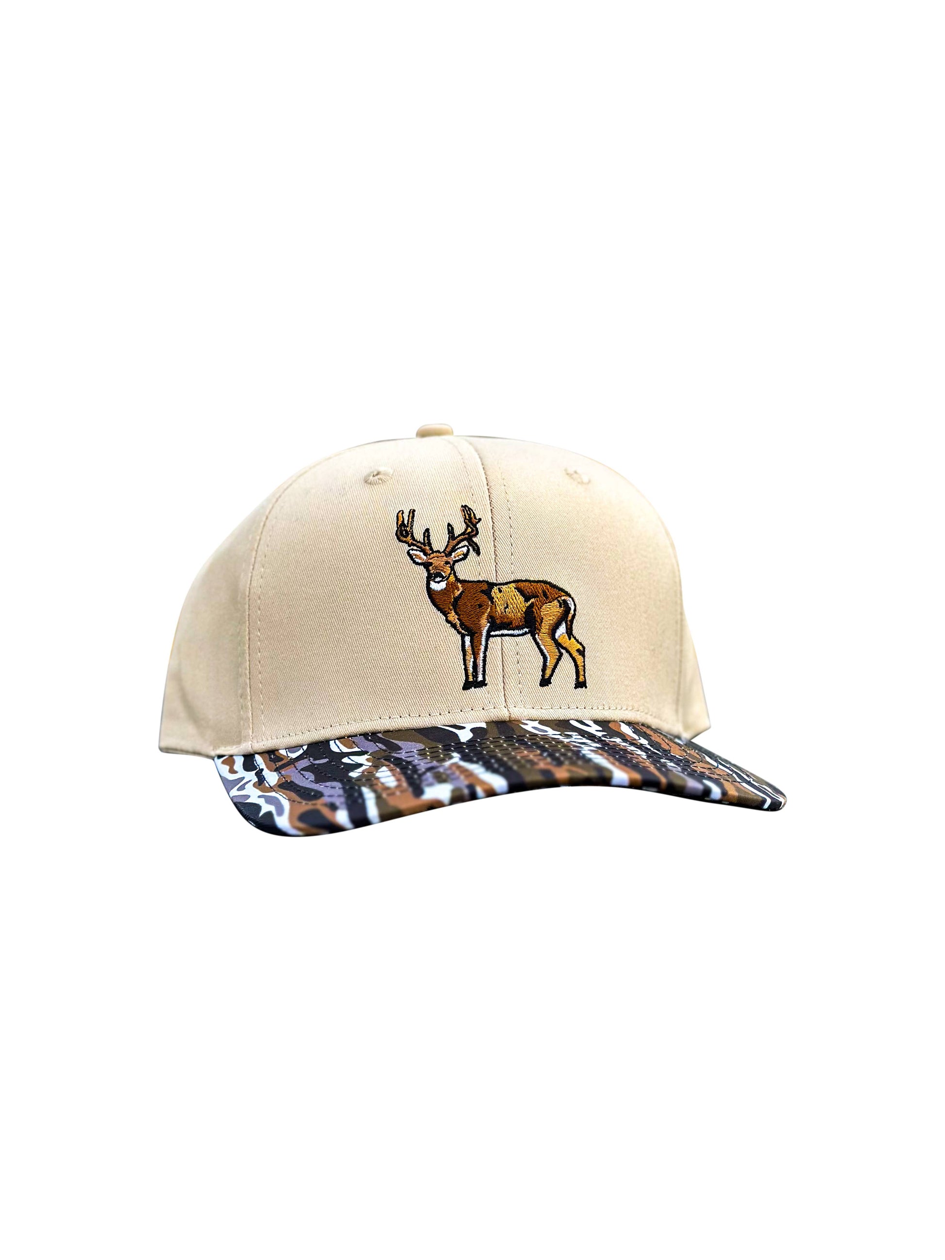 A 6-panel trucker high-profile hat that features our brand new "Ranch" camo on the bill, all around cream panels, and our "Buck" design!