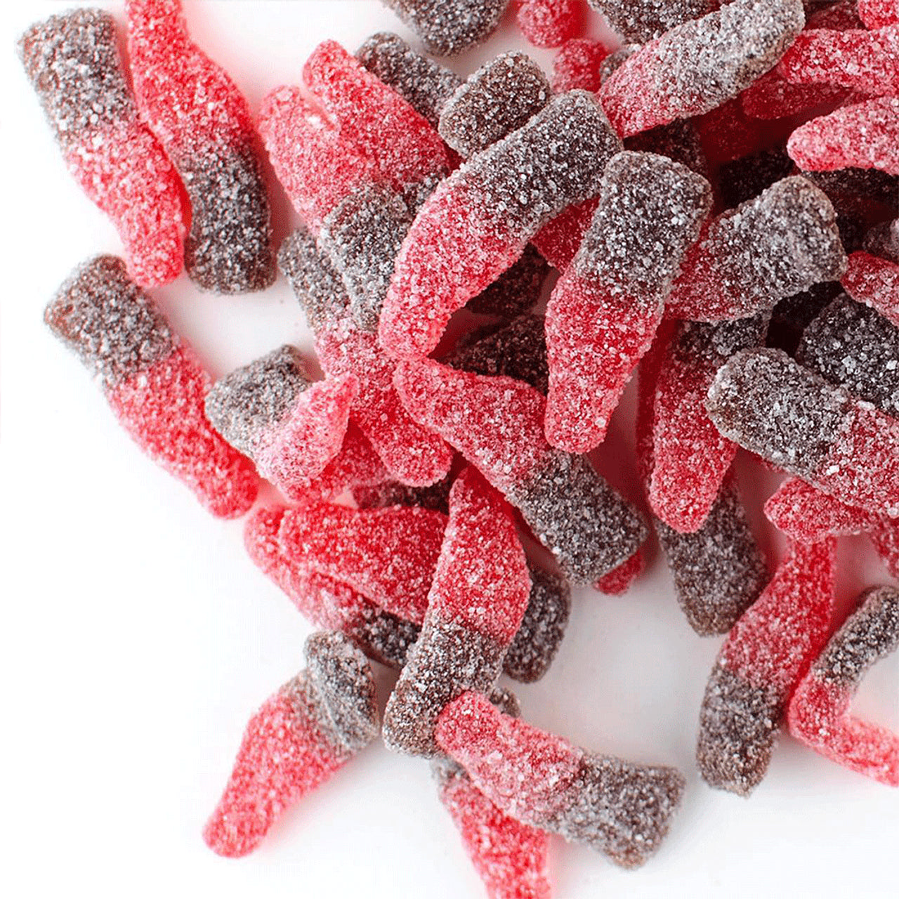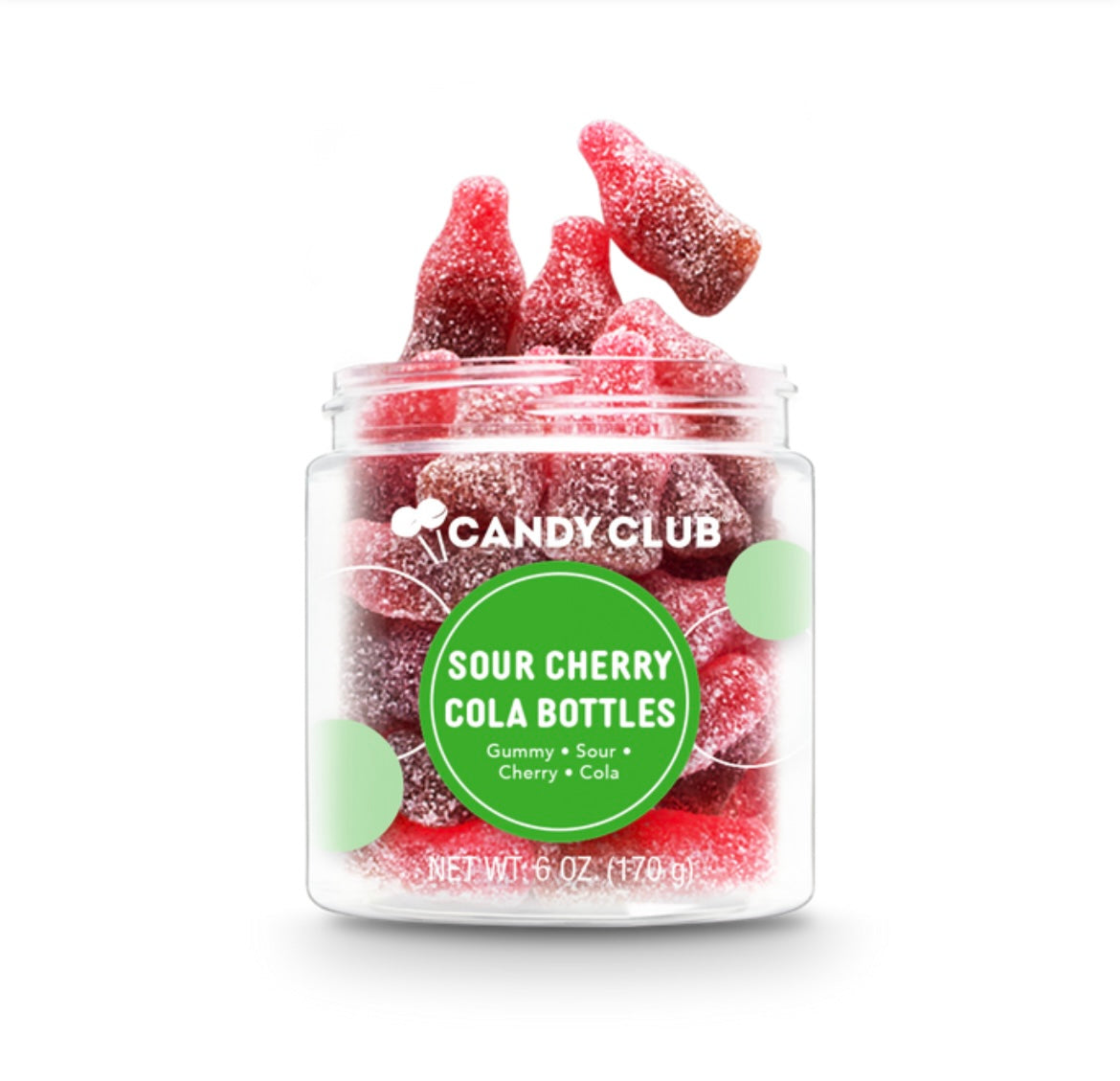 "Pop" open a jar of gummy bottles! Soda pop shaped gummy bottles that are covered in "fizzy" sour sugar and bursting with classic cherry cola flavor.