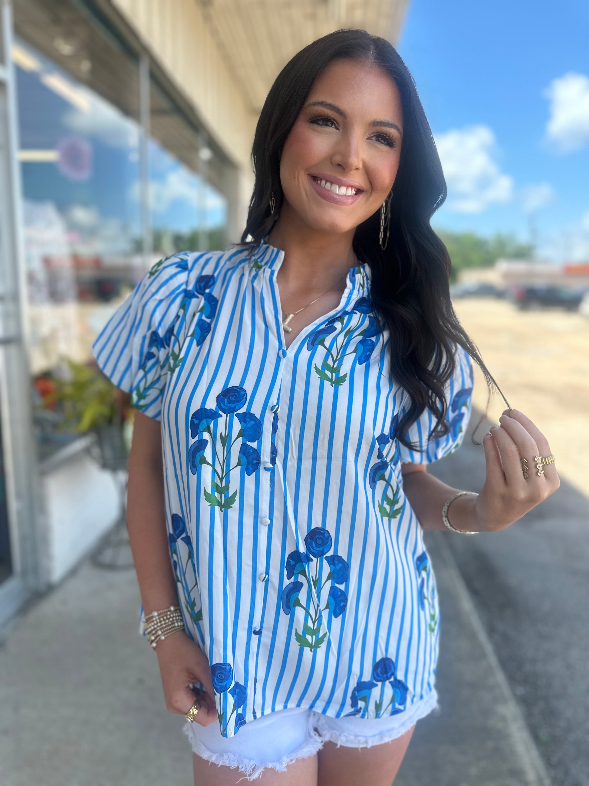 Stripe Floral Smocked V Neck Puff Sleeve Blouse