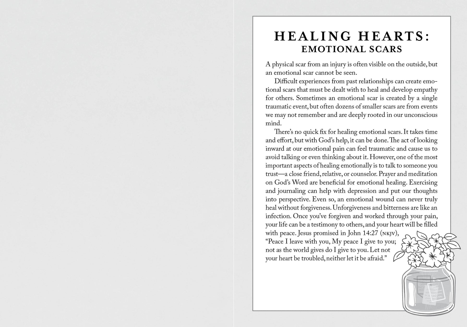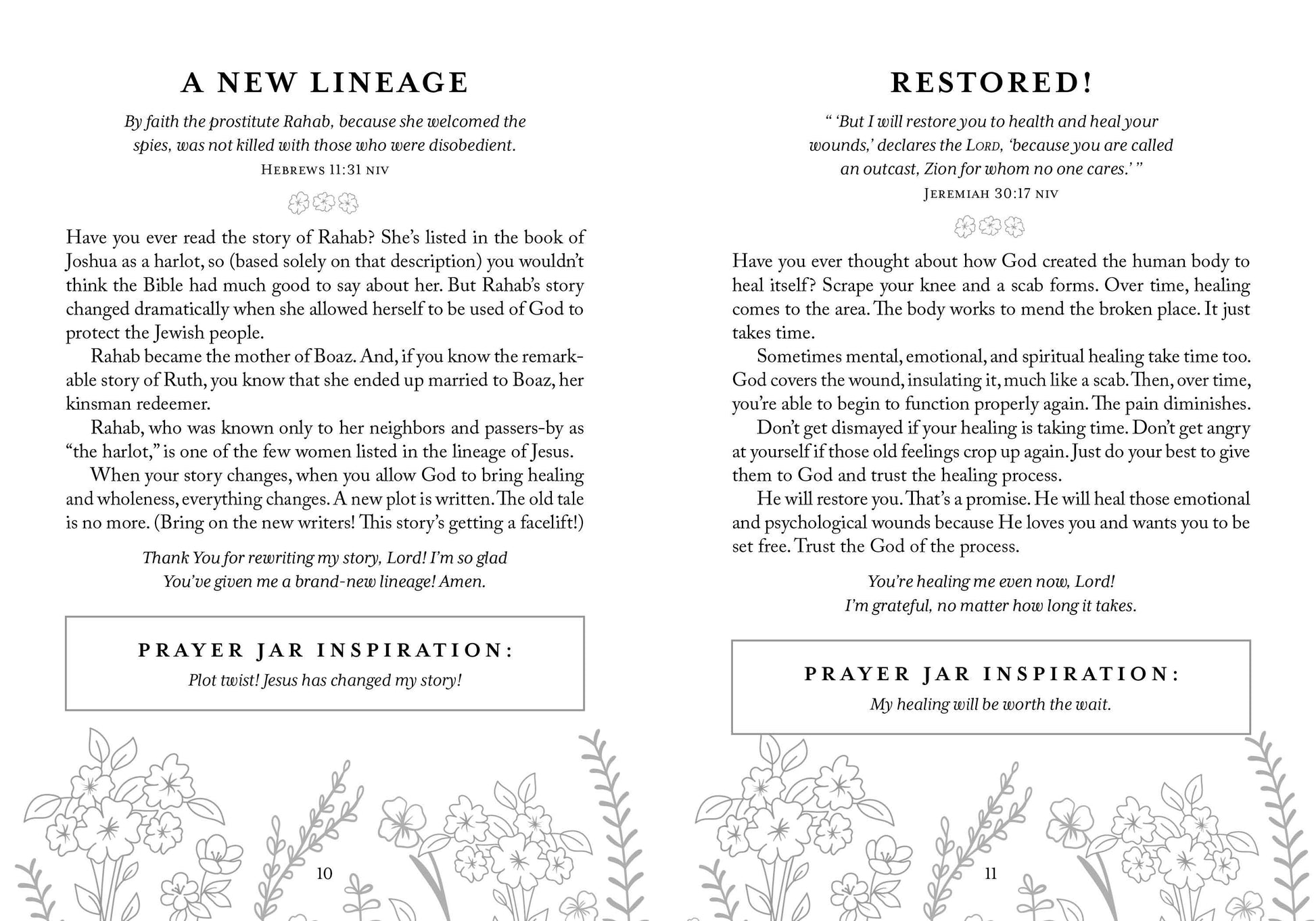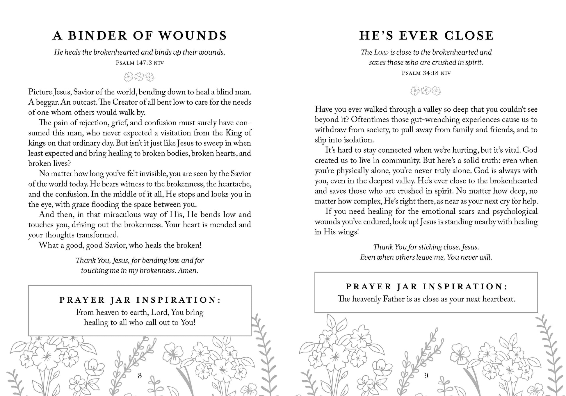 Your prayer life will be transformed as you read through these dozens of encouraging devotional readings centered around the theme of healing. With each turn of the page, you’ll discover unchanging truths of God’s Word alongside meaningful prompts that guide you to write and add your personal prayers or favorite, hope-filled Bible verses to your very own prayer jar. (Simple instructions are included in the introduction.)