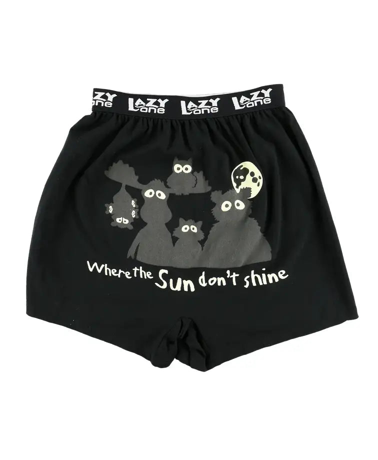 Anyone needing laugh would love our Where the Sun Don't Shine boxers! They even glow in the dark! Made from soft 100% combed cotton knit, our boxers have a roomy fit with a button fly and an exposed elastic band. It's easy to see why the butt stops here!